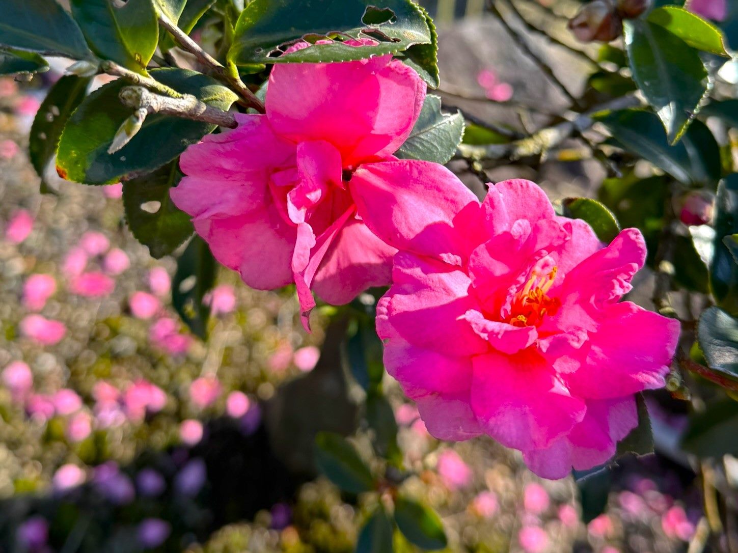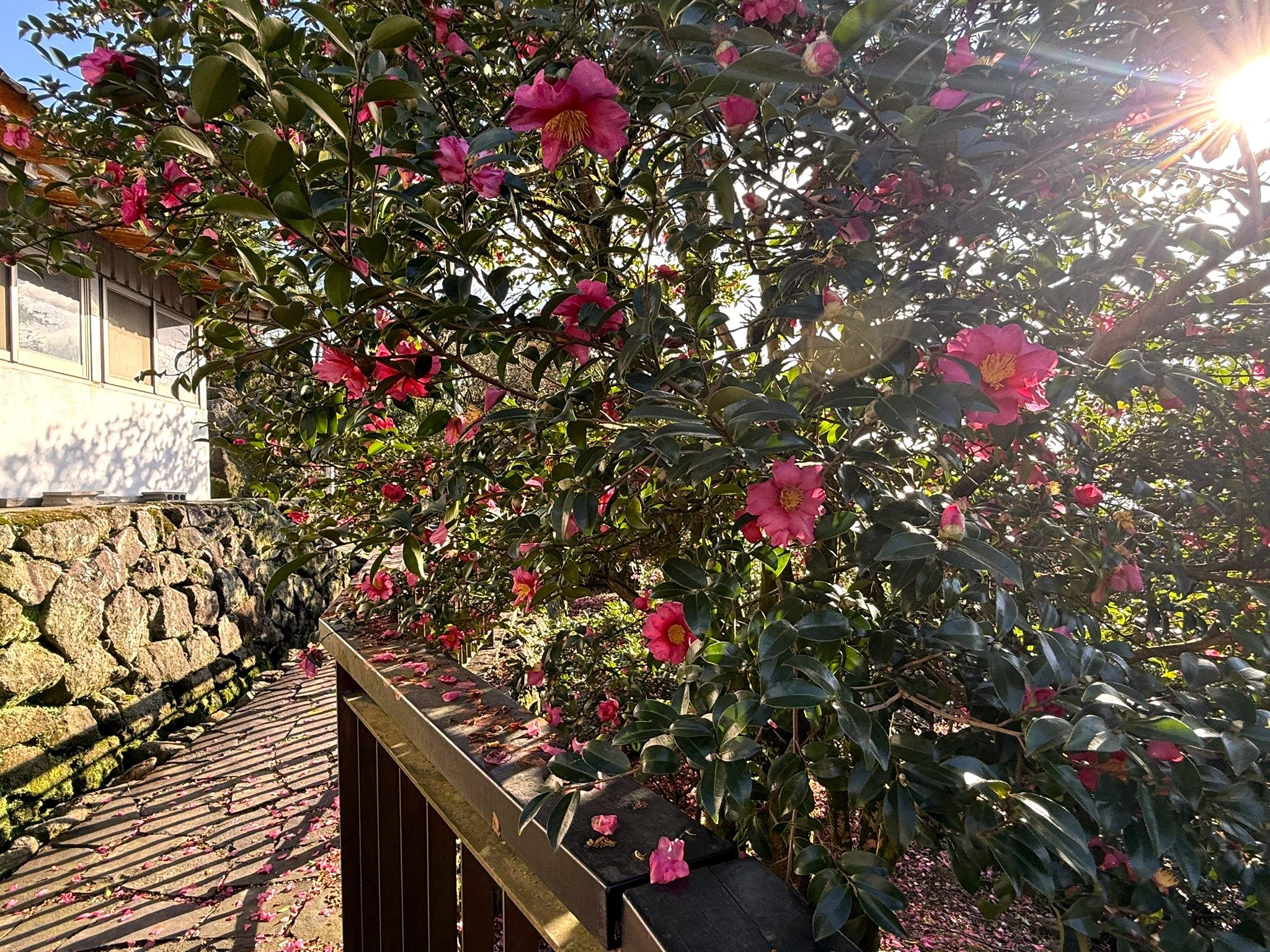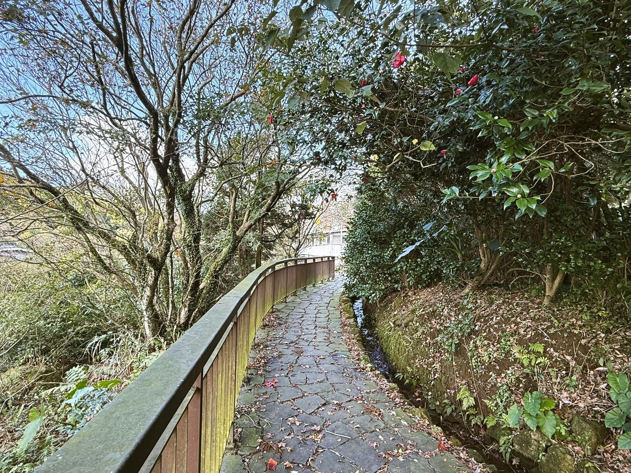 另外湖田國小對面有一條寂靜易行的水圳步道,從湖田國小對面入口進入沿著水圳連接至湖田橋,避免與車爭道,記得放慢腳步,觀賞水圳步道旁正恣意綻放的茶花,白色典雅、粉色嬌嫩、紅色艷麗,與遠處的芒草相互輝映。