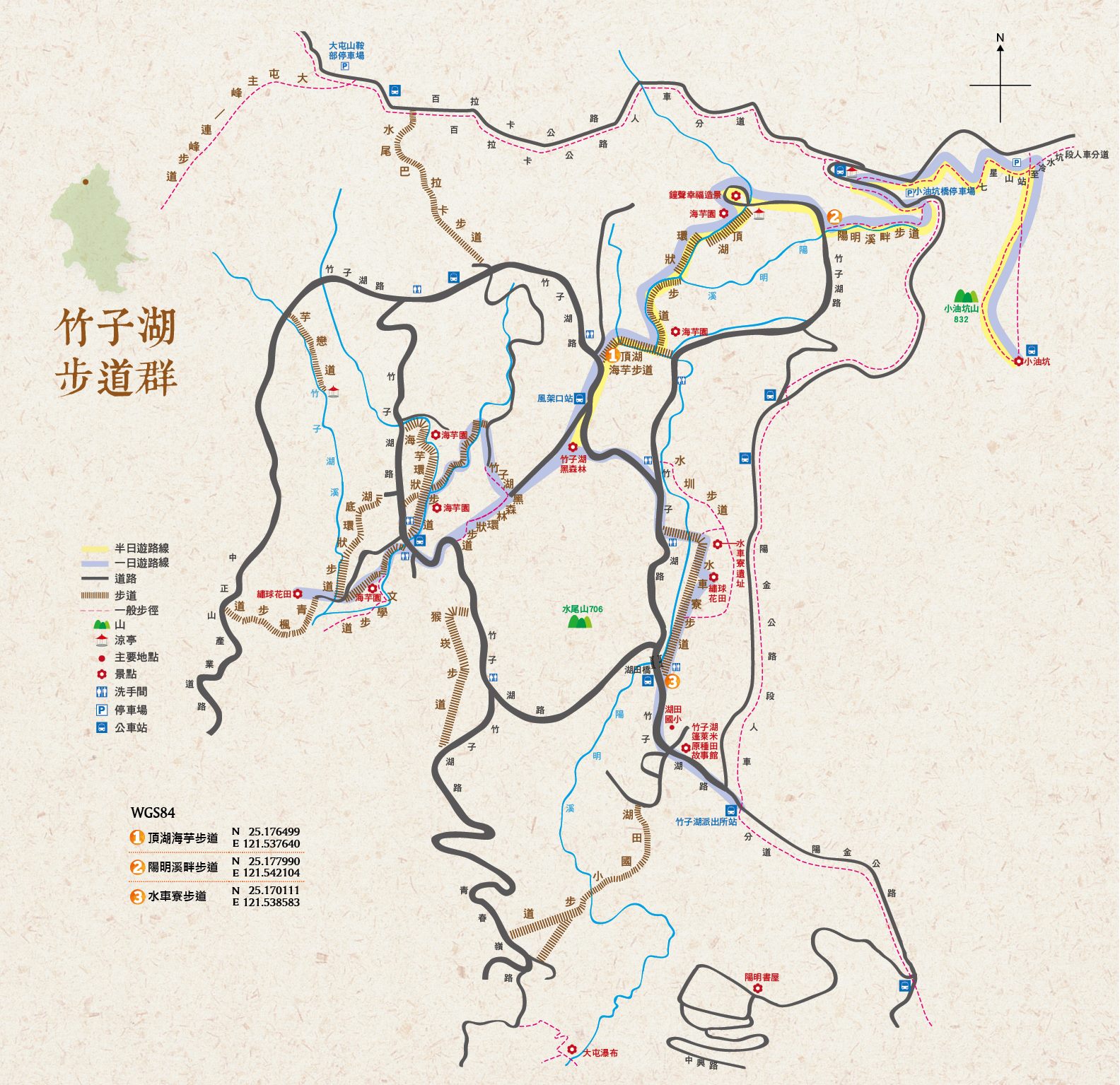 陽明溪水系發源於大屯山系,流經竹子湖頂湖地區,其中陽明溪支流整治時配合原地形營造自然野溪樣貌,溪流斷面寬淺且不對稱,運用「花山砌石工法」以大小不一的天然塊石鑲嵌疊砌,溪流旁蜿蜒的溪畔步道與頂湖環狀步道串聯,在冬季可以欣賞芒花隨風飛舞、遠眺四面環山的開闊視野。