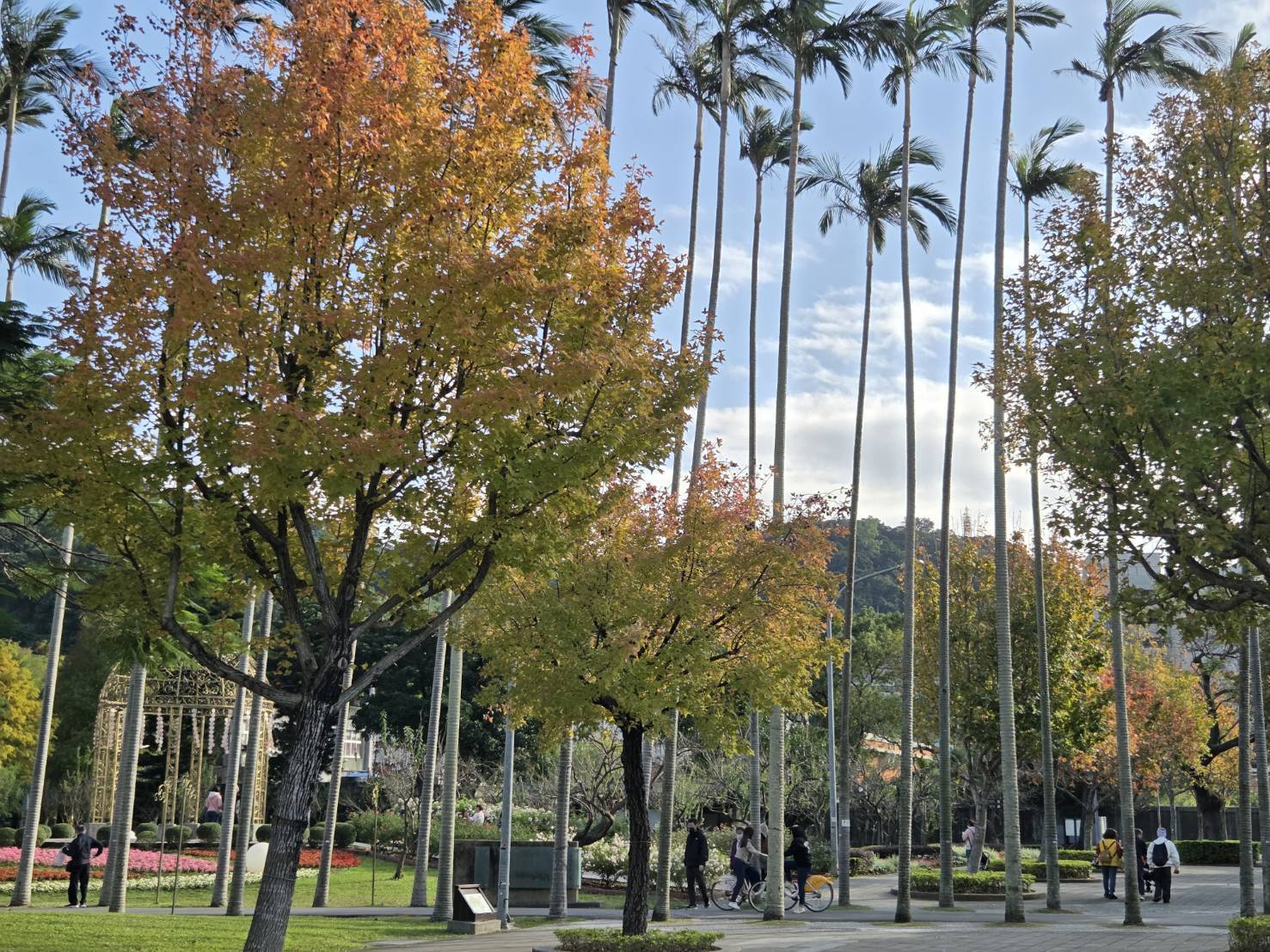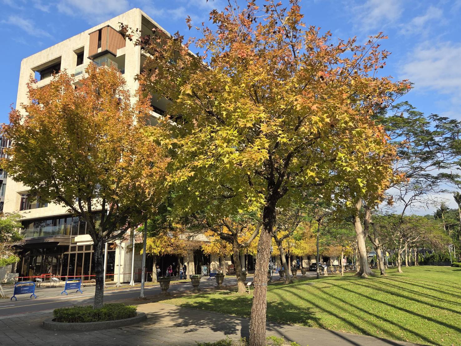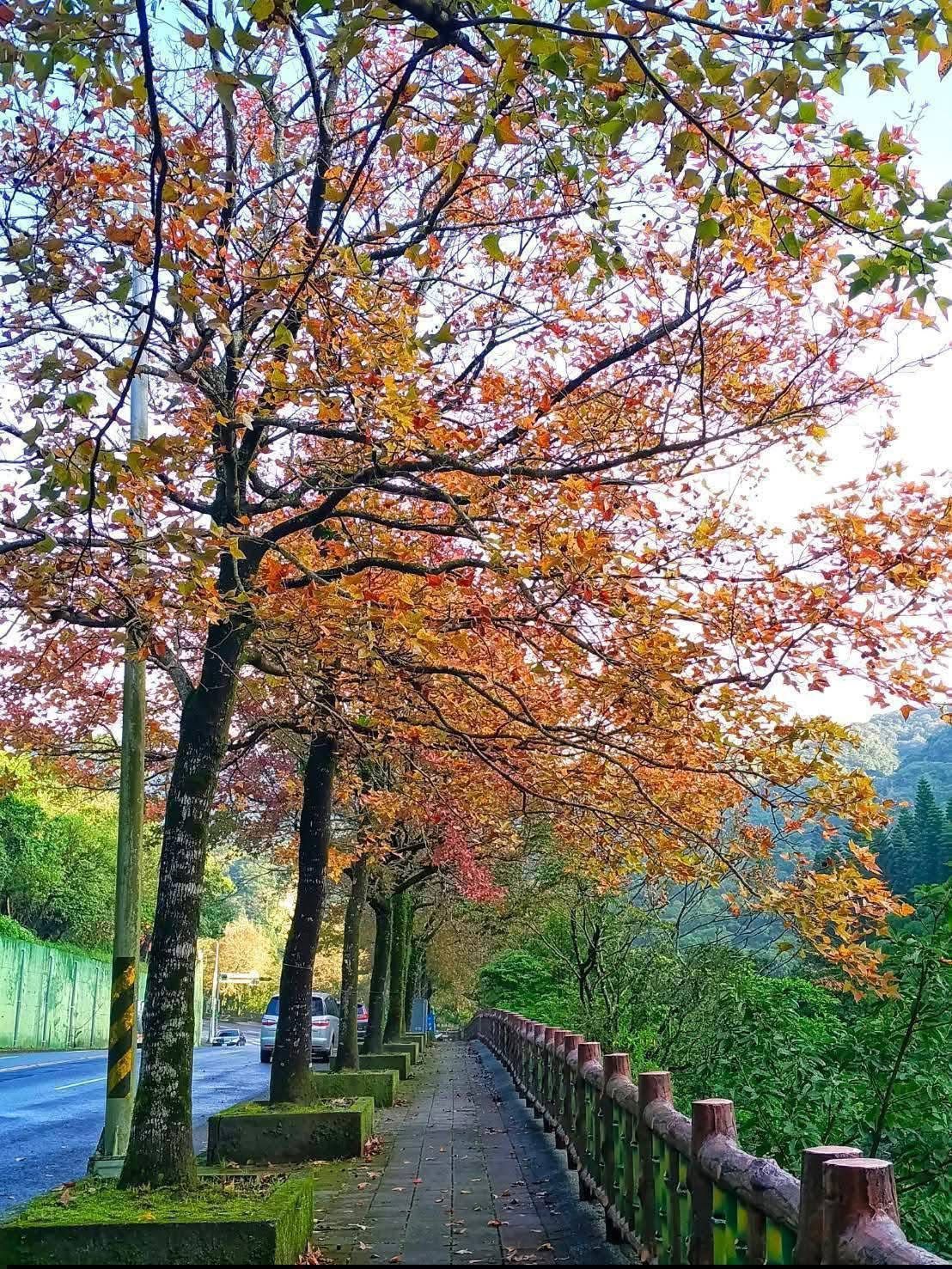 公園處表示,至善路1至3段、敬業三路、中山北路5段、康樂公園、林森公園、士林官邸公園、中山21號廣場等楓香目前均已變色,不管是晴天還是陰天,隨便拍都很美,而知名的中山北路1段至3段楓香林蔭也已開始變色,約2周後也會有優質美景可以觀賞。在寒冬裡的楓香林成行而立,枝幹挺立傲然,葉色從翠綠、金黃、亮橘到嫣紅交織並存,宛如秋日雲霞,微風拂過,片片紅葉鋪地,熱情萬放的楓香展現出靜謐且溫暖的城市美學,為忙碌的都會生活添上一抹沉靜的節奏。